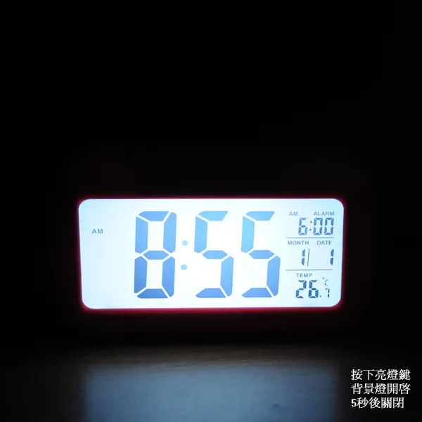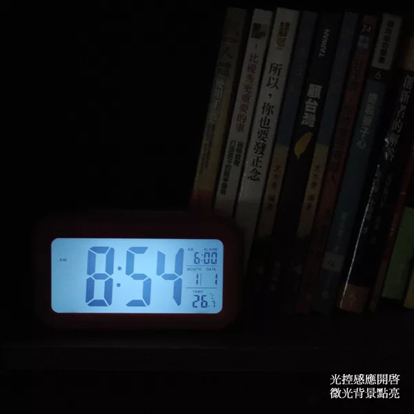 光控感應開關開啟時,光控感應裝置能自動感應四週光線強弱來打開微光背景,不用擔心摸黑不到鬧鐘、看不到時間
